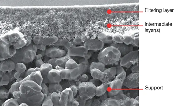 | Highly asymmetric structure with 12 μm ceramic support pore size | High flux and module capacity |