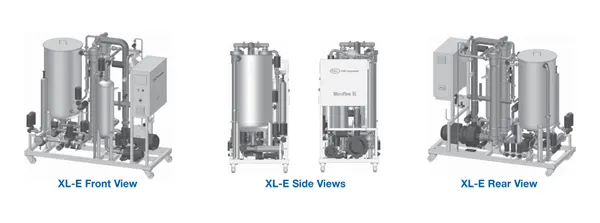 The Microflow XL-E Brine systems are operator controlled manual systems, incorporating one high capacity crossflow module. All product wetted components are constructed of 316L stainless steel. Piping manifold, membranes, pumps and instruments are mounted on a mobile frame, which includes the following: