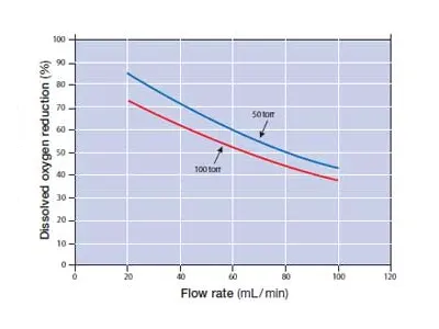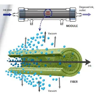 Passing the ink through the interior of the hollow fibers allows for sequential gas diffusion along the length of these fibers, from the inlet to the outlet of the module. This continuous ink degassing process is very effective for removing dissolved gases to very low levels. The extent of degassing can be controlled by regulating the vacuum level. Other factors, such as flow rate and temperature, will also affect the amount of dissolved gas removal.