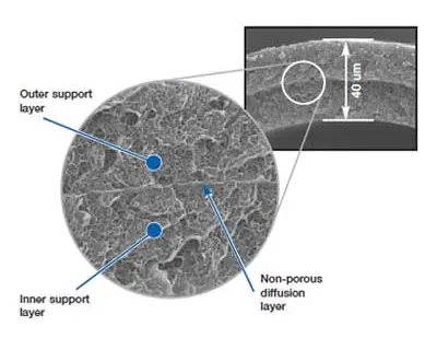 The UltiFuzor degas fiber has a thin, non-porous polyethylene membrane sandwiched between two protective, highly porous, polyethylene layers, as indicated in the photomicrograph to the left. The gas diffuses rapidly across the very thin middle layer, whereas its non-porous structure prevents even low surface tension inks from leaking into the vacuum line. The inner layer protects the fiber from being damaged by abrasive pigments and thus enhances on-stream life.