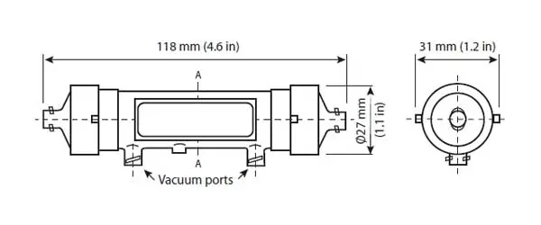 The module features a lumenside or interior fiber ink flow path and unique tri-layer hollow fiber technology, enabling high degas efficiency performance. The module incorporates a black housing for UV sensitive inks and easy-to-use female luer lock compatible connections.