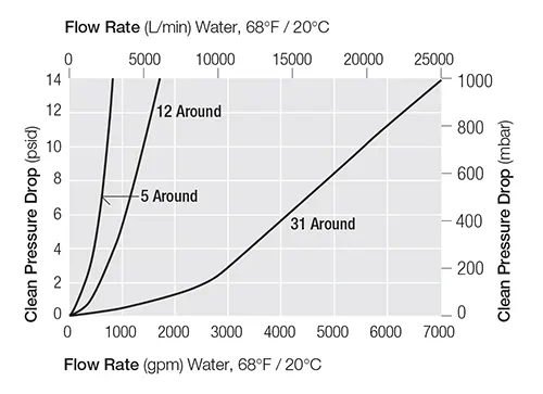 2 The liquid flow/pressure drop characteristics refer to the empty housing only for water at 20ºC / 68°F. For other liquids, multiply pressure drop by the specific gravity.